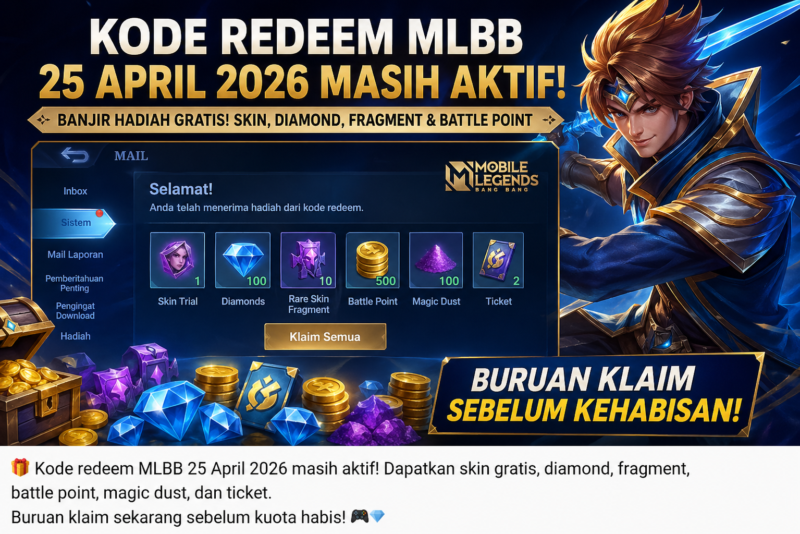 Jakarta-Gelombang “banjir hadiah” kembali mengguncang komunitas Mobile Legends pada Sabtu, 25 April 2026. Sejumlah kode redeem terbaru dilaporkan masih berpeluang aktif dan langsung diburu pemain karena menawarkan reward gratis tanpa top up. Momentum ini menjadi salah satu peluang terbaik bagi gamer untuk mendapatkan item premium secara cuma-cuma, mulai dari skin hingga resource penting dalam game.