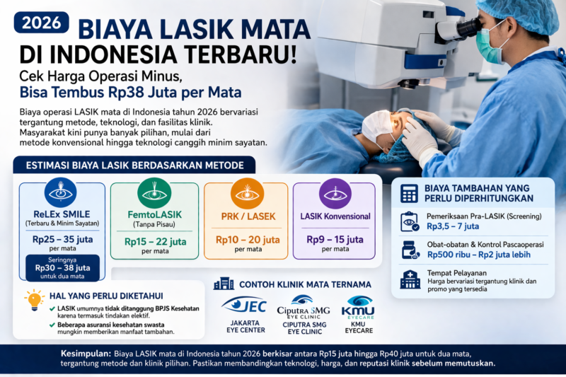 Jakarta-Biaya operasi LASIK mata di Indonesia pada tahun 2026 kembali menjadi perhatian, terutama bagi masyarakat yang ingin lepas dari kacamata atau lensa kontak. Dengan perkembangan teknologi kesehatan mata yang semakin canggih, harga tindakan ini pun cukup bervariasi, mulai dari belasan juta hingga puluhan juta rupiah tergantung metode yang digunakan dan fasilitas layanan kesehatan.