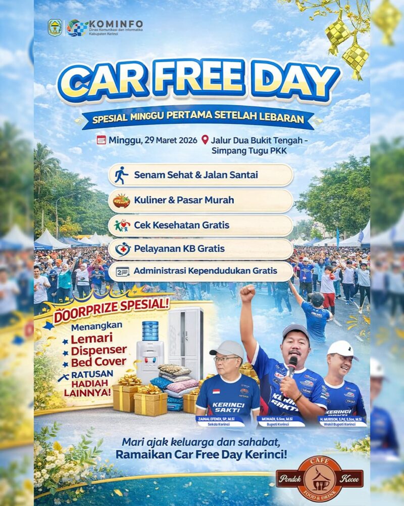 KERINCI – Pemerintah Kabupaten Kerinci melalui Dinas Komunikasi dan Informatika (Kominfo) kembali menghadirkan kegiatan Car Free Day spesial pada minggu pertama setelah Lebaran. Kegiatan ini dijadwalkan berlangsung pada Minggu, 29 Maret 2026, di sepanjang Jalur Dua Bukit Tengah hingga Simpang Tugu PKK.