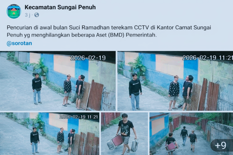 Sungai Penuh – Rekaman CCTV yang memperlihatkan aksi pencurian aset di kantor camat beredar luas di media sosial. Peristiwa itu disebut terjadi pada Jumat siang, saat kondisi sekitar kantor relatif sepi.