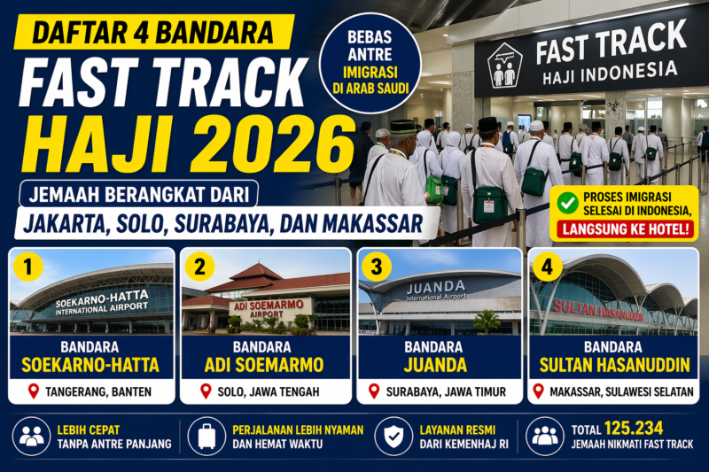 Jakarta-Pemerintah melalui Kementerian Haji dan Umrah resmi menerapkan layanan fast track imigrasi haji di empat bandara utama pada musim haji 2026. Kebijakan ini menjadi kabar baik bagi calon jemaah karena seluruh proses imigrasi Arab Saudi kini dapat diselesaikan sejak di Indonesia, sehingga waktu tunggu setibanya di Tanah Suci dapat dipangkas secara signifikan.