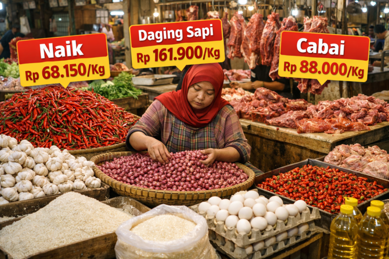 Kenaikan signifikan juga terlihat pada bawang putih yang kini mencapai Rp55.950 per kilogram, naik Rp15.700. Sementara itu, cabai merah ikut melonjak ke Rp68.000 per kilogram atau naik Rp14.750, memperkuat tren kenaikan harga komoditas dapur.