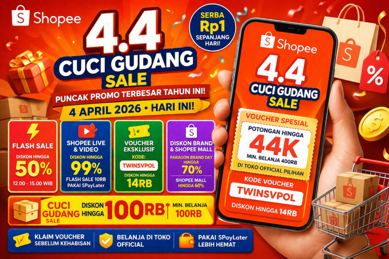 Kayonews-Gelaran promo besar dari Shopee kembali memuncak hari ini, 4 April 2026, lewat kampanye 4.4 Cuci Gudang Sale yang menghadirkan banjir diskon, voucher eksklusif, hingga promo ekstrem serba Rp1. Momentum ini menjadi salah satu event belanja paling ditunggu karena menawarkan potongan harga besar dengan kuota terbatas.
