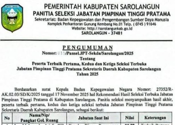 Ketiga nama tersebut kini diserahkan kepada Pejabat Pembina Kepegawaian (PPK)—dalam hal ini Bupati Sarolangun, H. Hurmin—untuk dipilih satu sebagai Sekda definitif. Sesuai ketentuan, PPK memiliki ruang pertimbangan mulai dari kebutuhan strategis daerah hingga evaluasi kinerja para calon.