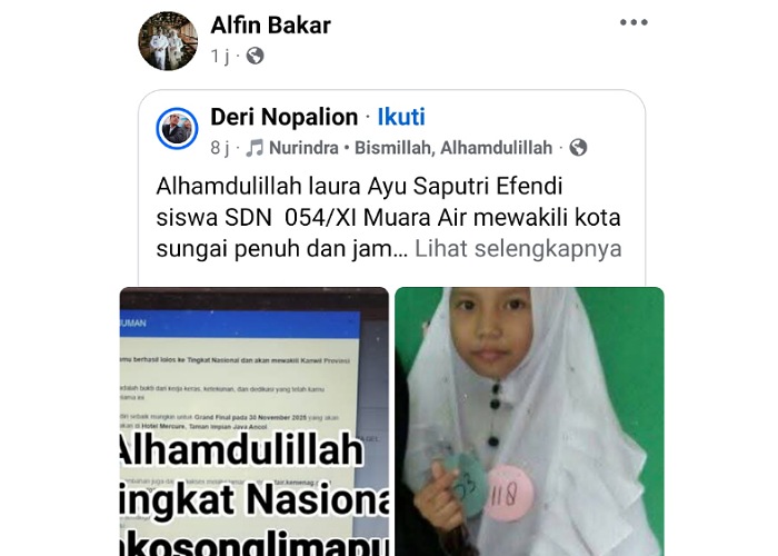 “Alhamdulillah, Laura Ayu Saputri Efendi mewakili Kota Sungai Penuh dan Jambi ke tingkat nasional dalam Olimpiade PAI. Semangat terus SDN 054/XI Muara Air!” demikian unggahan yang dibagikan Wali Kota.