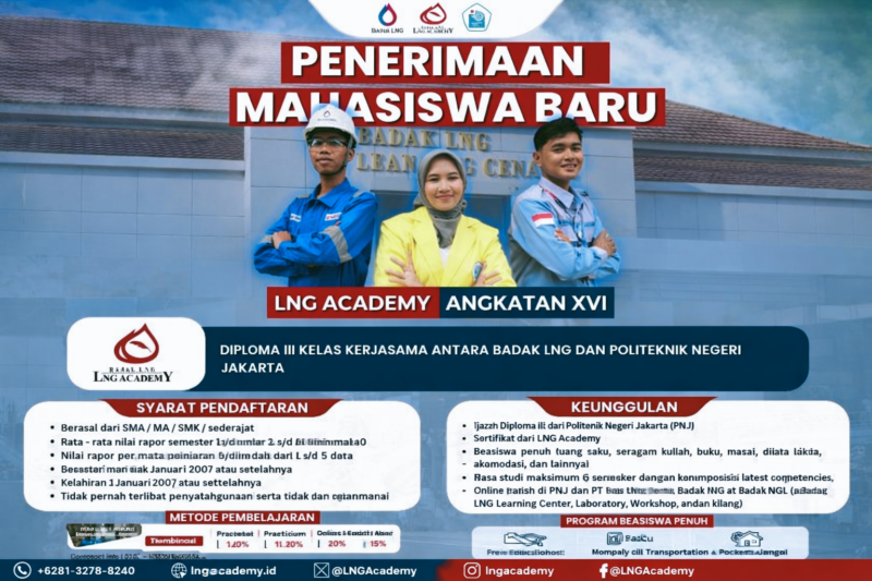 Jakarta – Politeknik Negeri Jakarta (PNJ) bekerja sama dengan Badak LNG resmi membuka pendaftaran Beasiswa LNG Academy 2026. Program ini terbuka bagi lulusan SMA/MA/SMK sederajat dari seluruh Indonesia, dengan batas akhir pendaftaran 13 Maret 2026.