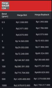 Galeri 24 menjual berbagai jenis logam mulia, mulai dari emas Antam, Galeri 24, hingga UBS, dengan ukuran yang bervariasi antara 0,5 gram sampai 1.000 gram. Harga emas 1 gram Galeri 24 dibanderol Rp2.971.000 atau turun dari harga kemarin yang dibanderol Rp2.981.000 per gram.
