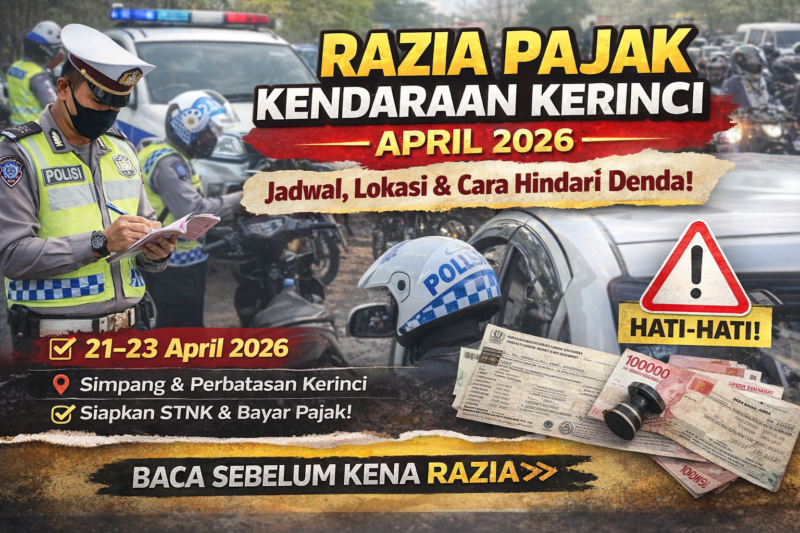 Kerinci-Pemerintah Provinsi Jambi melalui Badan Pendapatan Daerah resmi mengumumkan pelaksanaan razia penertiban pajak kendaraan bermotor di wilayah Kabupaten Kerinci pada 21 hingga 23 April 2026. Kegiatan ini bertujuan meningkatkan kepatuhan masyarakat terhadap kewajiban pajak kendaraan sekaligus menindak kendaraan yang belum melakukan registrasi ulang atau mutasi sesuai aturan.
